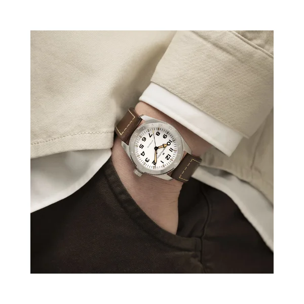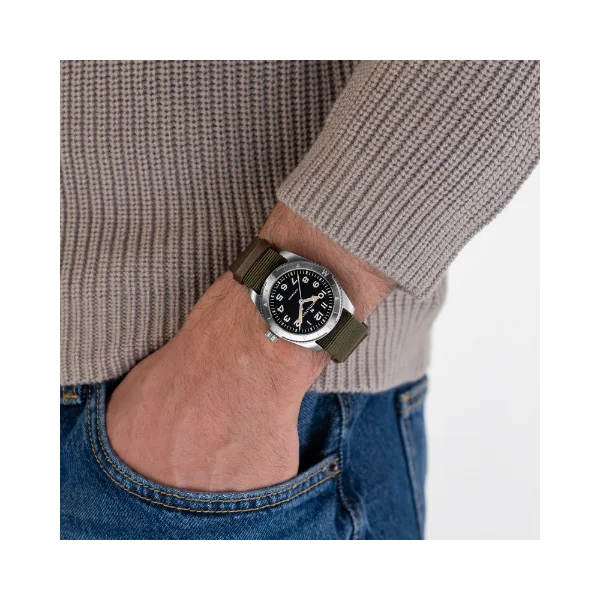 Al planificar una expedición, su equipo esencial es fiable, resistente, funcional y compacto. Con 38 mm, este reloj supera con creces sus expectativas en cuanto a características de inspiración militar. Un diseño audaz, una caja y correa robustas y resistentes, y un movimiento que no le defraudará. Con 80 horas de reserva de marcha típica en el exclusivo calibre automático H-10, el Khaki Field Auto le mantendrá en marcha.